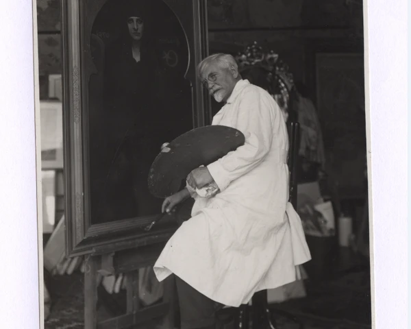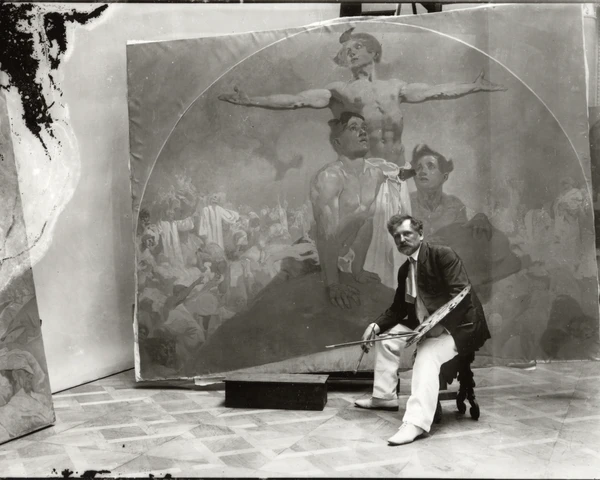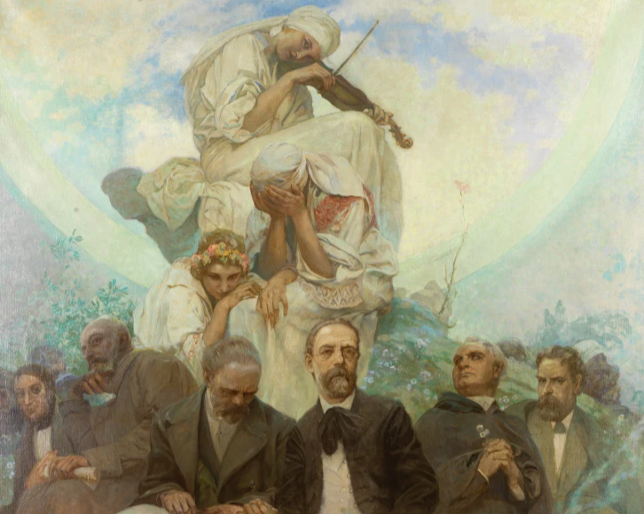 Tento původní olej na plátně je tak trochu záhadou. Podle Jiřího Muchy, umělcova syna, byl reprodukován jako jakýsi pamětní kalendář, ale zdá se poněkud nepravděpodobné, že by Mucha vytvořil tak propracovaný obraz pro tak běžný účel. Pravděpodobnější je, že byl původně namalován k nějaké významnější příležitosti a jeho použití jako kalendáře bylo až dodatečné rozhodnutí. Obraz je ódou na několik slavných českých skladatelů, které obdivující andělé oslavují a osvěcují. Vousatý muž uprostřed je Bedřich Smetana (1824–1884), nejznámější díky opeře Prodaná nevěsta a romantické symfonické básni Vltava. Vedle něj sedí Antonín Dvořák (1841–1904), skladatel Symfonie Z Nového světa, s tužkou a papírem; na jeho druhé straně, v uctivém postoji, je Pavel Křížkovský (1820–1885), skladatel sborové a duchovní hudby a jeden z Muchových mentorů. Vlevo od Dvořáka je Gottfried Rieger (1764–1855), plodný moravský skladatel a dirigent, a úplně vlevo František Škroup (1801–1862), autor české národní hymny. Na kraji vpravo je Zdeněk Fibich, skladatel, který vytvořil melodramatickou hudební formu.