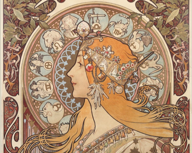 Jeden z Muchových nejpopulárnějších návrhů – Zvěrokruh – byl původně vytvořen pro Champenoise jako firemní kalendář na rok 1897. Návrh však natolik upoutal šéfredaktora časopisu La Plume, že k němu zakoupil práva a vydal ho jako kalendář časopisu na tentýž rok. Zvěrokruh byl vytvořen minimálně v devíti variantách, včetně této, jež byly vytištěny bez doprovodného textu jako dekorativní panó.