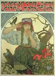 Der mährische Lehrerchor war ein Gesangsensemble, dessen Repertoire von klassischer über populäre bis hin zur Volksmusik reichte, einschließlich Kompositionen von Leoš Janáček. Der Chor war in den böhmischen Gebieten sowie in Europa und den Vereinigten Staaten auf Tournee. Auf dem Plakat ist eine junge Frau zu sehen, die eine Volkstracht aus der Region Kyjov trägt und als aufmerksame Zuhörerin dargestellt ist. Ihre Gestalt erinnert an das dekorative Tafelbild Musik aus dem Zyklus Die vier Künste.