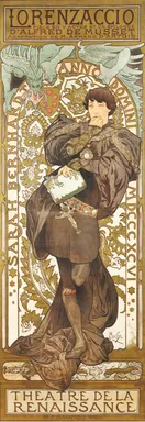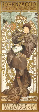 In Alfred de Mussets Drama Lorenzaccio spielte Sarah Bernhardt den männlichen Helden, Lorenzo de’ Medici, zum Zeitpunkt der Belagerung von Florenz durch den Tyrannen Alessandro de’ Medici, der symbolisch als Drache dargestellt wird, der das Florentiner Wappen bedroht. Lorenzo denkt über den Mord an Alessandro nach, der im unteren Abschnitt des Plakats dargestellt ist.