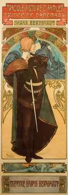 Sarah Bernhardt spielte die männliche Hauptrolle in Shakespeares Hamlet, das von Eugène Morand und Marcel Schwob für sie ins Französische übersetzt wurde. Hinter der zentralen Figur des Hamlet erscheint der Geist seines ermordeten Vaters, der an den Befestigungsmauern von Helsingör umhergeistert, im Hintergrund. Ophelia, die ertrunken ist, liegt, geschmückt mit Blumen, zu Hamlets Füßen. Hamlet war das letzte Plakat, das Mucha für Sarah gestaltete.
