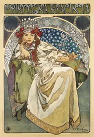 Das Plakat der Prinzessin Hyazinthe bewirbt Ladislav Nováks und Oskar Nedbals Pantomime-Ballett, in dem die berühmte Schauspielerin Andula Sedláčková mitwirkte. Das Hyazinthenmotiv wiederholt sich im gesamten Bild, von den bestickten Gewändern und dem beeindruckenden Silberschmuck bis hin zu dem symbolischen Ring, den die Prinzessin hält.