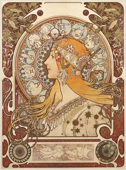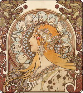 Eines von Muchas bekanntesten Bildern, der Tierkreis, wurde ursprünglich für Champenoise als interner Kalender für das Jahr 1897 gefertigt. Dem Chefredakteur von La Plume gefiel es jedoch so gut, dass er die Rechte für den Vertrieb als Kalender der Zeitschrift für das betreffende Jahr erwarb. Es gibt mindestens neun Versionen des Tierkreises, einschließlich der hier gezeigten Version, die ohne Begleittext zur Verwendung als dekoratives Tafelbild gedruckt wurde.