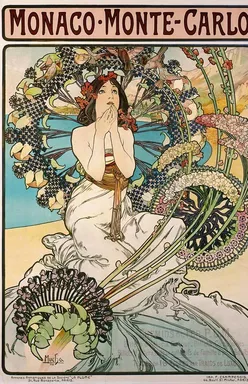 Mucha kreierte hier ein sehr prächtiges Bild. Das schüchterne Mädchen, kniend und gefesselt von der Ruhe der Bucht von Monte-Carlo, ist vollständig umgeben von den gebogenen Stängeln von Flieder und Hortensie. In diesem Bild finden wir einige der grazilsten Blütenblätter, die Mucha jemals gemalt hat. Da der Kunde ein Eisenbahnunternehmen – Chemin de Fer P.L.M. – war, gilt als wahrscheinlich, dass im Bild die Schienen und Räder dargestellt werden sollten, die die Besucher nach Monte-Carlo bringen.